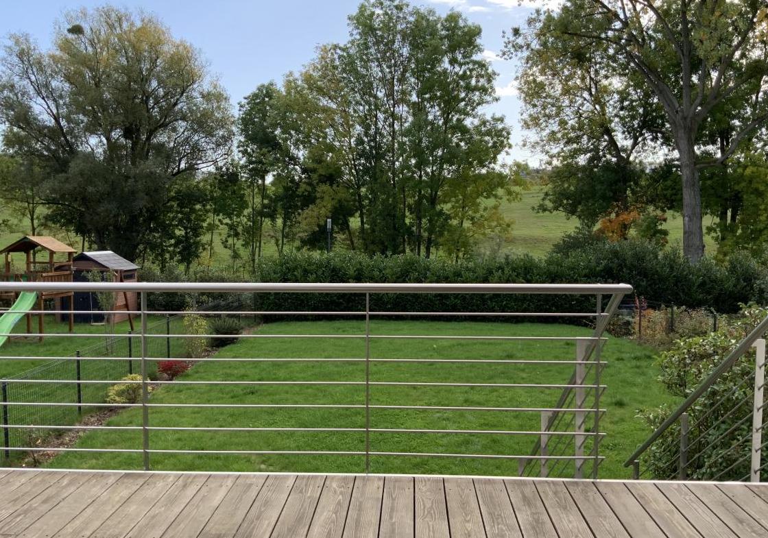 Au rez-de-chaussée: entrée avec placard encastré, un WC séparé, une très belle cuisine aménagée semi-ouverte sur un grand séjour et donnant sur une terrasse en bois avec vue dégagée et un jardin exposé sud-est.